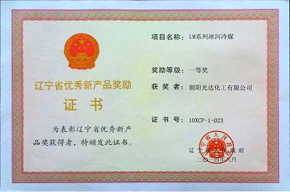 朝陽光達化工有限公司研發生產的專利產品—LM系列冰河冷媒榮獲遼寧省優秀新產品!