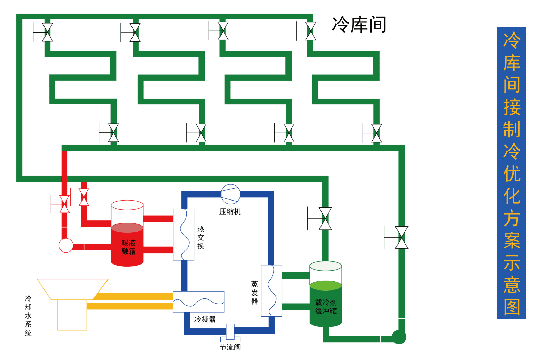 介紹一種間接制冷技術(shù),在制冷系統(tǒng)管路中增加二次冷卻液儲(chǔ)液罐,使制冷劑將冷量傳遞給載冷劑,然后再通過泵在常壓下將載冷劑的冷量傳遞給庫房實(shí)現(xiàn)制冷。同時(shí)該系統(tǒng)在壓縮機(jī)后設(shè)有熱交換器及除霜液儲(chǔ)罐,當(dāng)冷庫間進(jìn)行除霜時(shí),將除霜液通過泵輸送到冷庫間進(jìn)行熱除霜。