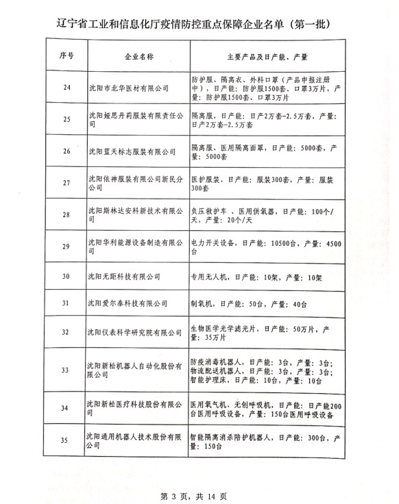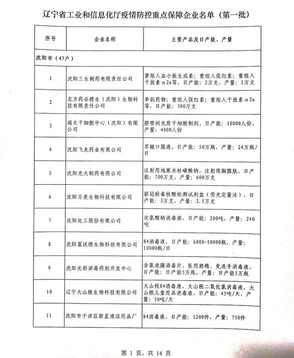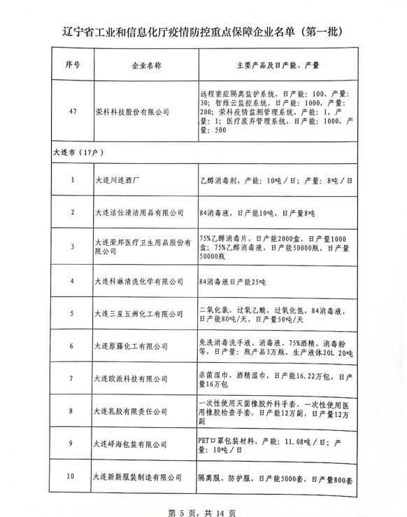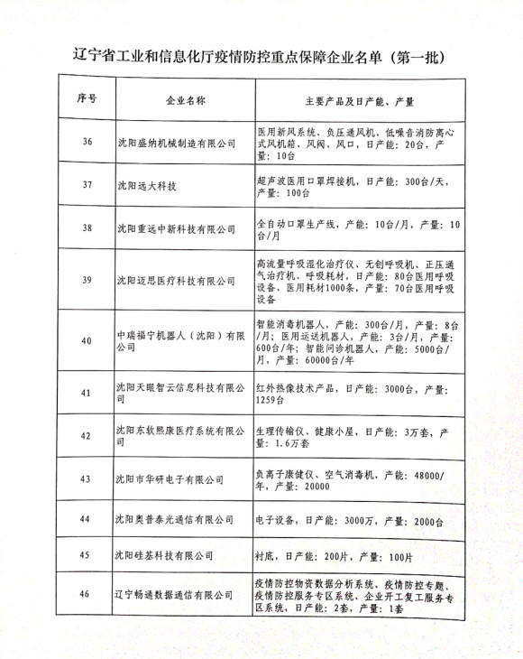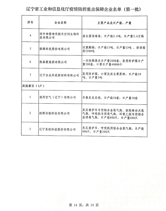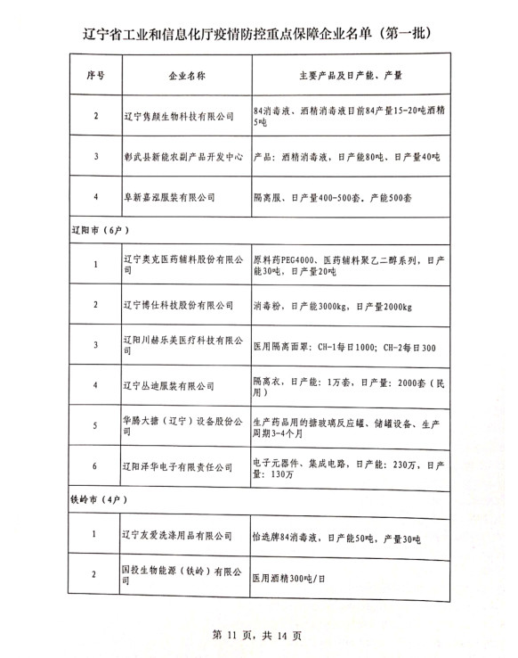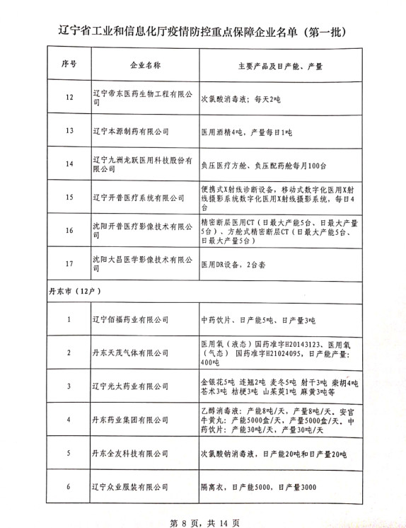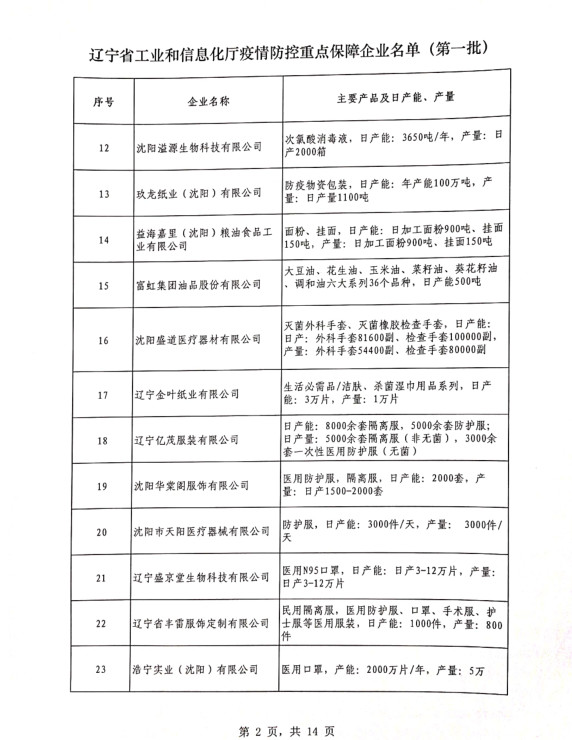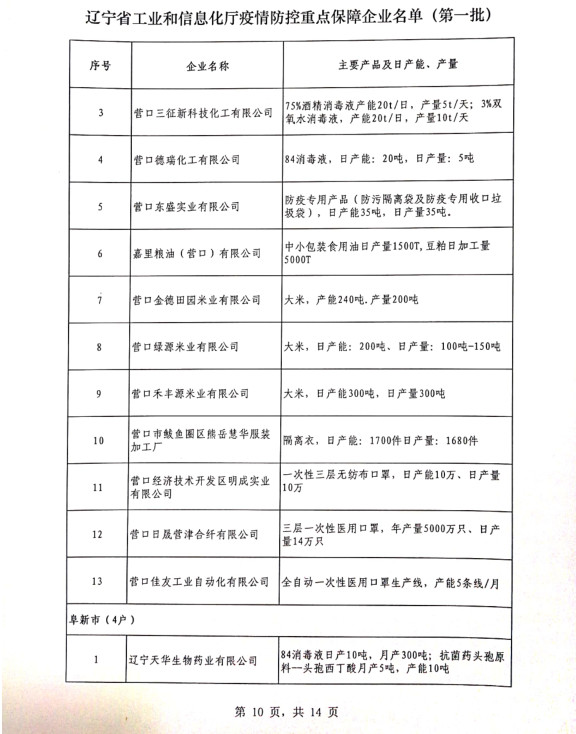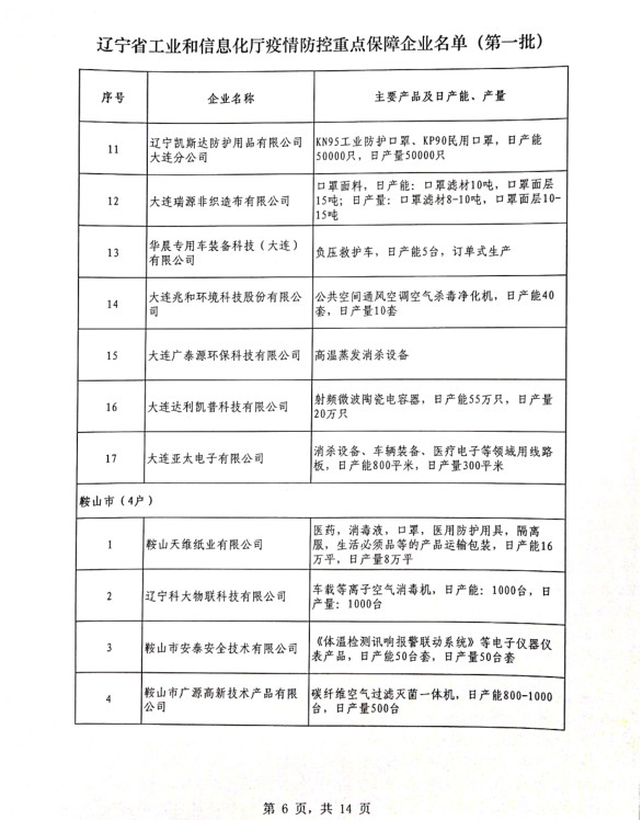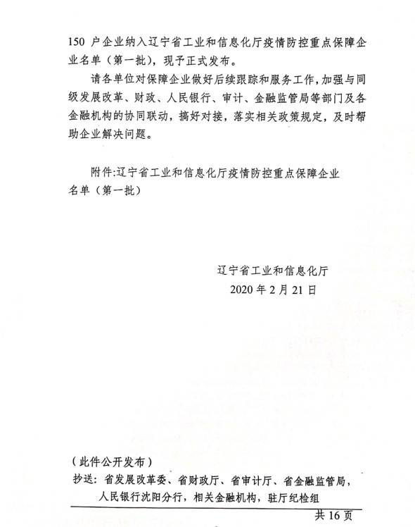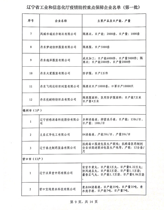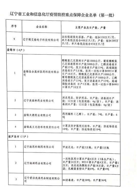 為貫徹落實習(xí)近平總書記關(guān)于疫情防控工作的重要講話和指示批示精神,落實黨中央、國務(wù)院和省委、省政府有關(guān)部署,按照《遼寧省人民政府關(guān)于印發(fā)遼寧省應(yīng)對新型冠狀病毒感染的肺炎疫情支持中小企業(yè)生產(chǎn)經(jīng)營若干政策措施的通知》(遼政發(fā)【2020】6號)和《遼寧省工業(yè)和信息化廳關(guān)于規(guī)范省級疫情防控重點保障企業(yè)名單管理有關(guān)事項的通知》(遼工信明電【2020】35號)要求,在各市審核推薦的基礎(chǔ)上,經(jīng)我廳認(rèn)真研究,決定以下150戶企業(yè)納入遼寧省工業(yè)和信息化廳疫情防控重點保障企業(yè)名單(第一批)。