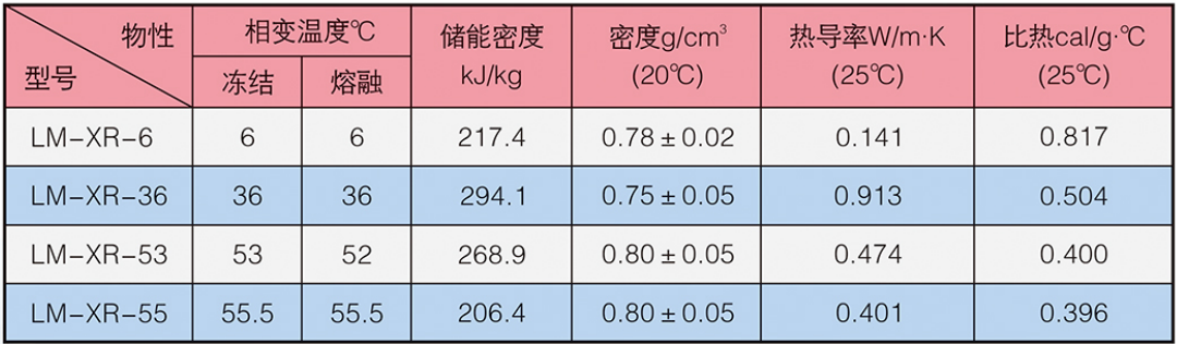 LM-XR系列產品由主儲能劑、相變調整劑、防過冷劑、防相分離劑、誘發劑等多組分復合制備而成。本品通過固-液-固相態變化實現熱能的儲存和釋放,具有較高的儲能密度及合適的比熱和導熱系數。本品不易揮發、安全可靠,可以反復使用。