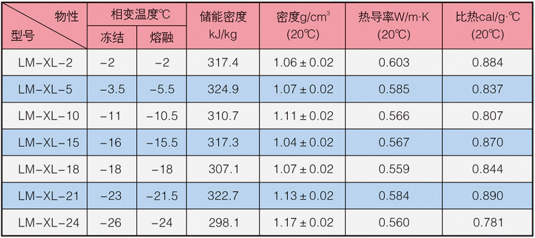 LM-XL系列產品由主儲能劑、相變調整劑、防過冷劑、防相分離劑、誘發劑等多組分復合制備而成。本品通過液-固-液相態變化實現冷能的儲存和釋放,具有較高的儲能密度及合適的比熱和導熱系數。本品不易揮發、安全可靠,可以反復使用。
